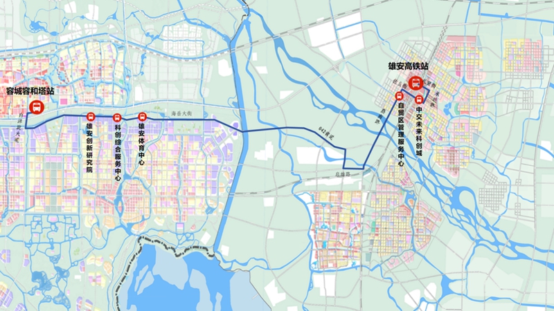 线路中途设站5处,分别为中交未来科创城、自贸区管理服务中心、雄安体育中心、科创综合服务中心、雄安创新研究院。