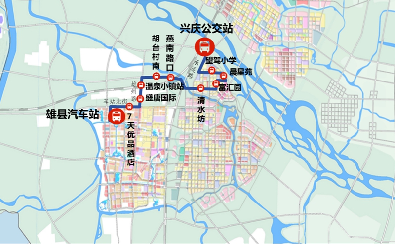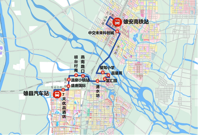 线路全程由雄安站出发,经礼贤街、燕南路、佐良街、承运路、望驾街、海岳东大街、爱景街、同德三路、燕赵东大街、启雄路、雄州路、车站北街、车站西路、车站南街到达终点雄县汽车站。