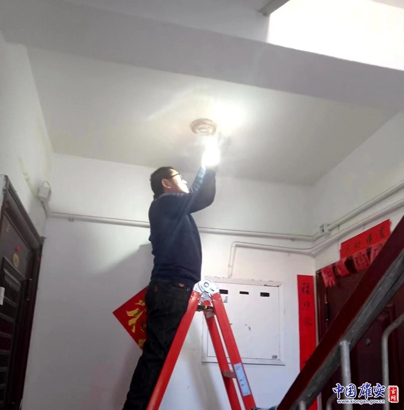 图为物业公司工作人员给居民楼道替换电灯。雄县愿景和家物业管理有限公司供图