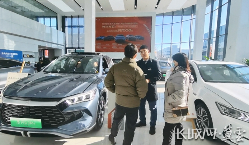 比亚迪河北同驰王朝网4S店内,销售人员正在接待顾客。