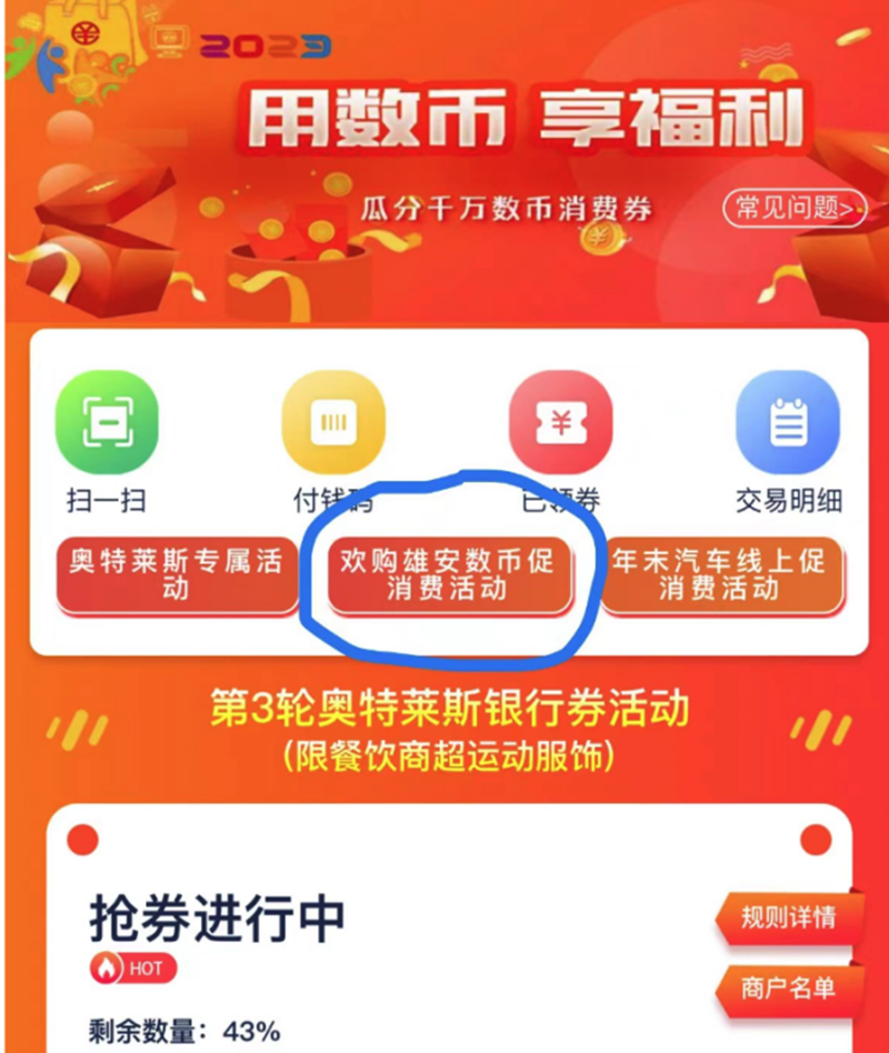 请注意,由于目前同时在举行奥特莱斯促消费活动,需要您点击雄安新消费APP顶部“欢购雄安数币促消费活动”按钮后快速移动至欢购雄安消费券专区,如下图所示: