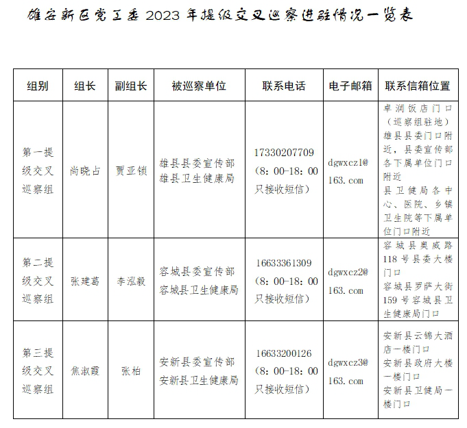 经新区党工委批准,新区党工委2023年提级交叉巡察,组建3个巡察组,对雄县县委宣传部、卫生健康局,容城县委宣传部、卫生健康局,安新县委宣传部、卫生健康局6个单位开展提级交叉巡察。被巡察单位分别召开巡察工作进驻动员会,各县委巡察工作领导小组领导出席会议并讲话。
