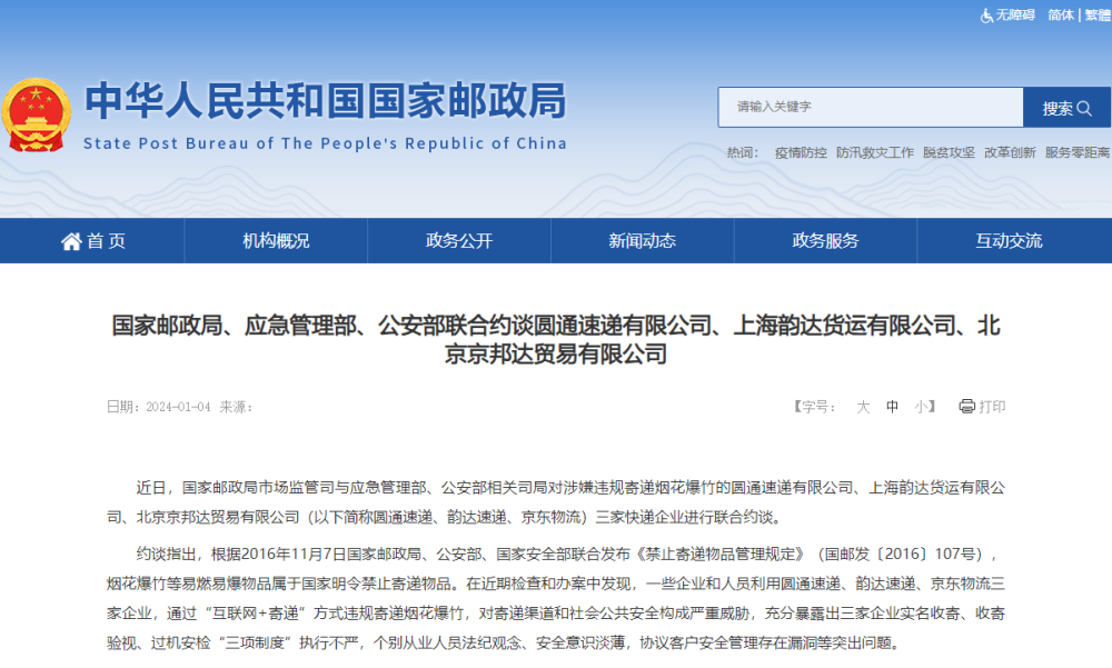 近日,国家邮政局市场监管司与应急管理部、公安部相关司局对涉嫌违规寄递烟花爆竹的圆通速递有限公司、上海韵达货运有限公司、北京京邦达贸易有限公司(以下简称圆通速递、韵达速递、京东物流)三家快递企业进行联合约谈。