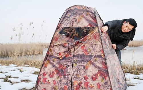 1月5日,白洋淀“鸟叔”韩战桥在淀边搭起帐篷,准备开始他的野外鸟类观测、巡护工作。河北日报见习记者刘光昱 摄