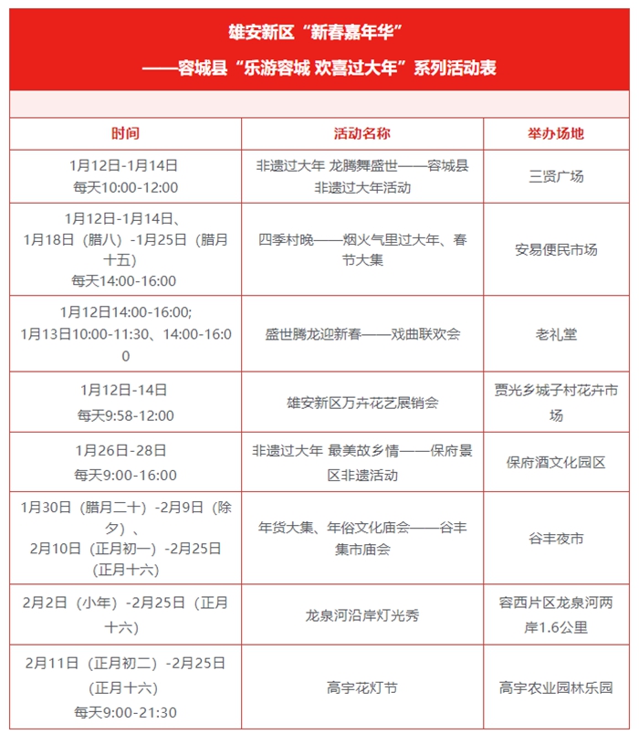据悉,此次“乐游容城 欢喜过大年”系列活动将持续至3月份,“非遗过大年”“村晚过大年”“戏曲过大年”“民俗过大年”“逛集过大年”“景区里过大年”“冰雪过大年”“城市景观里过大年”等八大场景活动,为新区群众营造欢乐、祥和、喜庆的节日氛围。