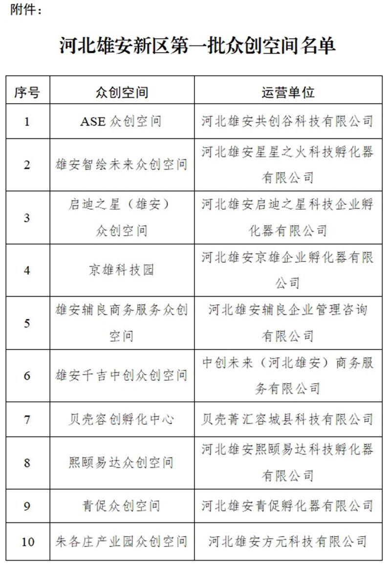 附件:河北雄安新区第一批众创空间名单