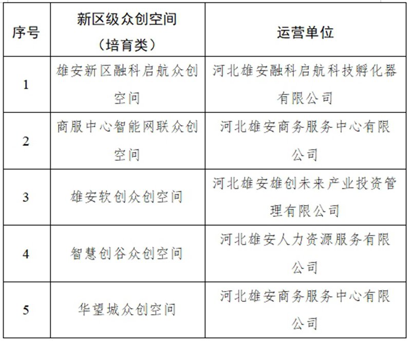 为深入实施创新驱动发展战略,引导雄安新区众创空间高质量发展,根据《河北雄安新区众创空间备案管理办法》(雄安改发〔2023〕731号)要求,按照有关程序确定第一批新区级众创空间10家、新区级众创空间(培育类)5家。现将名单予以公布。