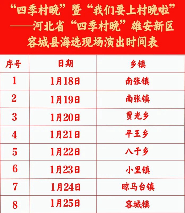 据悉,此次活动由容西管委会、容城县委宣传部、容城县文联、各乡镇主办,时间为1月18日至25日,以乡镇为单位,每天下午在安易便民市场进行节目展演与海选,旨在响应“双争”号召,推动全县乡村文化和旅游深度融合,培育文明乡风,深化农村精神文明建设,丰富春节期间人民群众精神文化生活,营造欢乐、祥和、喜庆的节日氛围,同时为接下来举行的河北省“村晚过大年”雄安新区站展演活动选拔优秀节目。