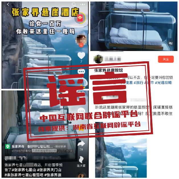 真相:近日,某短视频平台出现多条所谓“张家界悬崖酒店”的视频,视频显示“几张由玻璃罩着的床,整齐地排列在悬崖上”,文案称“张家界悬崖旅馆房费一个晚上500元”。对此,经媒体记者采访核查,张家界文旅局及张家界国家森林公园景区工作人员均表示“不知道悬崖旅馆”。同时,记者问询张家界多家酒店、客栈,均未找到视频中的“悬崖酒店”。(来源:上游新闻)
