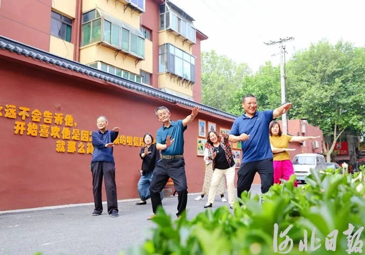 近日,宁晋县邮电公寓小区居民在文化墙前学练健身操。河北日报记者赵永辉 摄