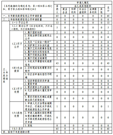 (二)依申请公开。细化完善依申请公开办理流程,聚焦解决依申请公开堵点难点问题,加强信息分析研判,最大限度满足申请人合理信息需求,切实提高依申请公开办理工作时度效和群众满意度。全年共受理依申请公开65件,办理因政府信息公开引起的行政复议、行政诉讼1件;妥善处置多起信息公开咨询、投诉、举报。