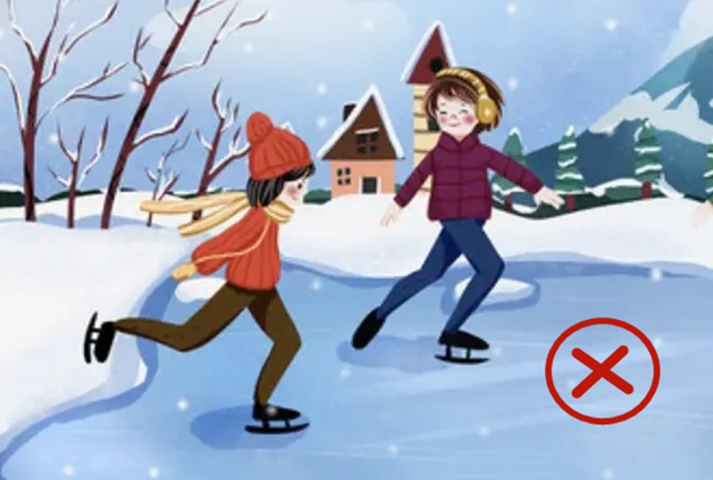 七、进行冰上活动应选择有安全防护设施的正规场所,并佩戴必要的防护用具,儿童滑冰游玩应有成年人陪同,不到封冻结冰的池塘、水库玩耍、冰钓或滑冰;发现有人落水或坠入冰窟,未成年人不要贸然下水救援,在大声呼救的同时,迅速拨打报警电话寻求帮助。