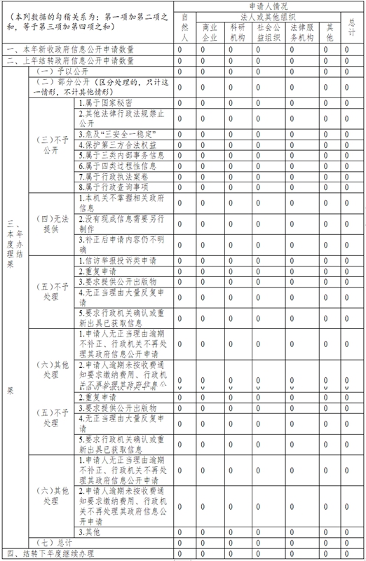 本报告根据《中华人民共和国政府信息公开条例》(以下简称《条例》)《中华人民共和国政府信息公开工作年度报告格式》(国办公开办函〔2021〕30号)相关要求编制,内容包括总体情况、主动公开政府信息情况、收到和处理政府信息公开申请情况、政府信息公开行政复议和行政诉讼情况、存在的主要问题及改进情况、其他需要报告的事项等六个部分。本年度报告所列数据统计期限为2023年1月1日至12月31日。