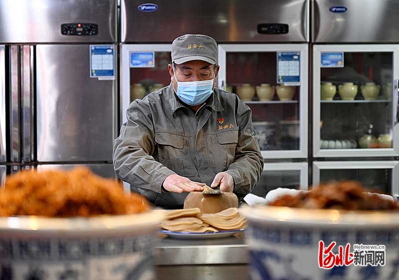 1月28日,北京六必居前门店传承人工作室内,酱菜传承人现场加工来自张家口的苤蓝。河北日报记者张昊 摄