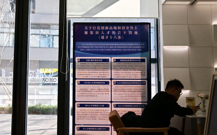 雄安新区一家咖啡馆内张贴的《雄才十六条》。2023年11月30日新华社记者牟宇 摄