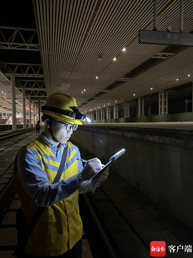 1月29日晚上12点,在最后一班列车停运后,28岁的海南铁路三亚房建工区工长王小啟戴好安全帽,拿上工具,在三亚站开始了当晚的工作。只见他时而俯身测量限界,将一组组测量数据记录在本子上,时而探起身子贴近站台,仔细检查站台帽石情况,一晚上的工作相当于做了上百个蹲起。