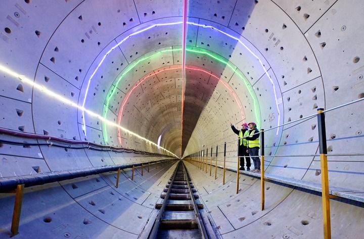 2024年2月3日,工作人员在北京轨道交通22号线河北段盾构隧道内进行巡查。新华社记者 王晓 摄