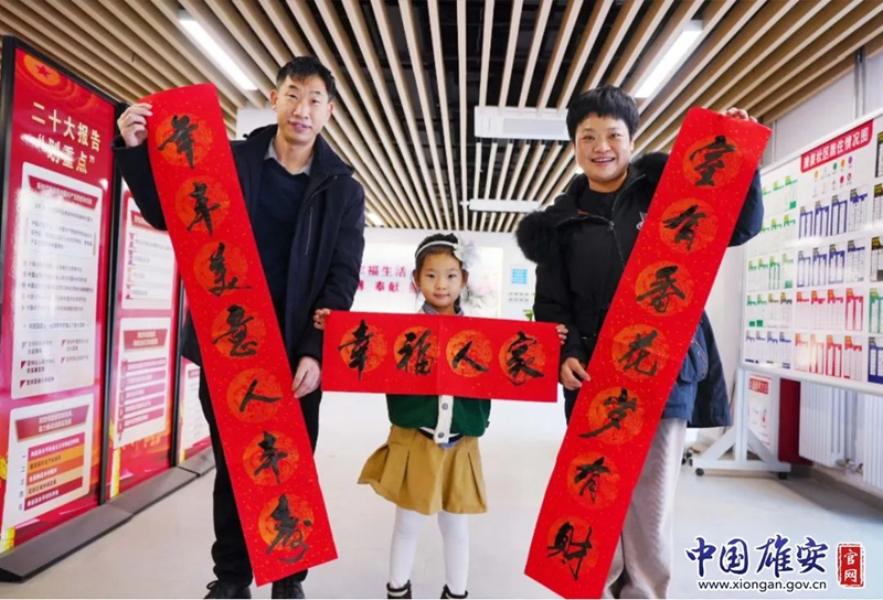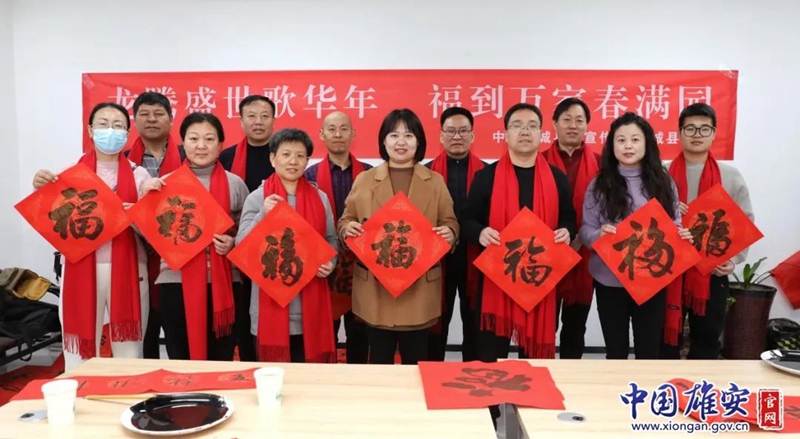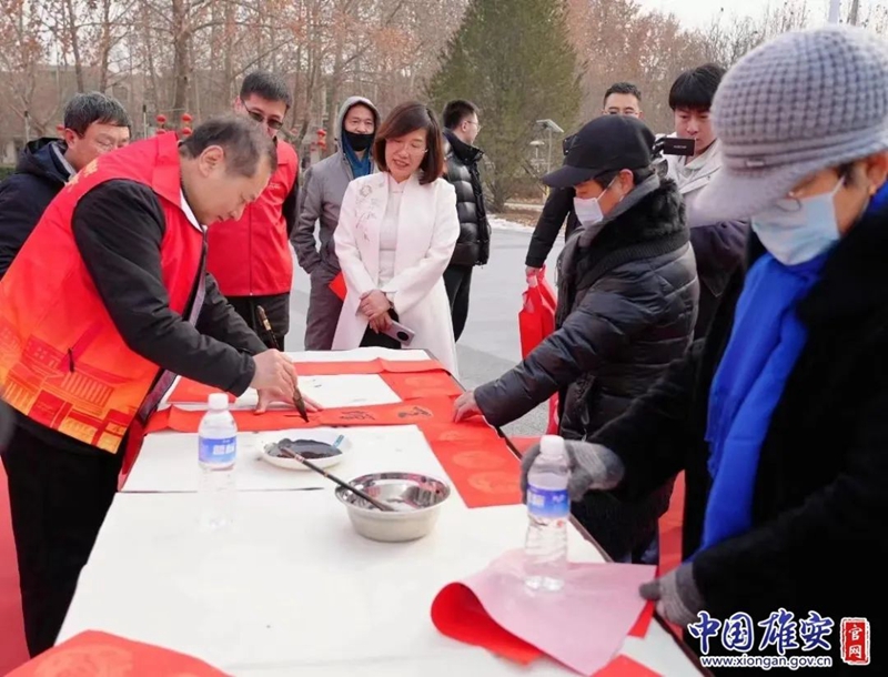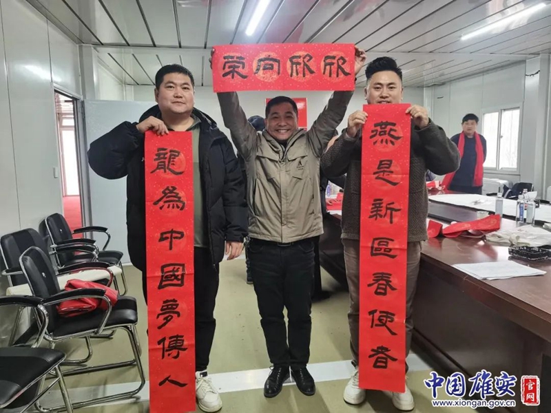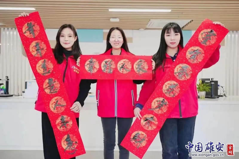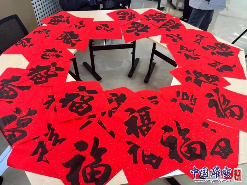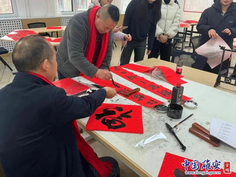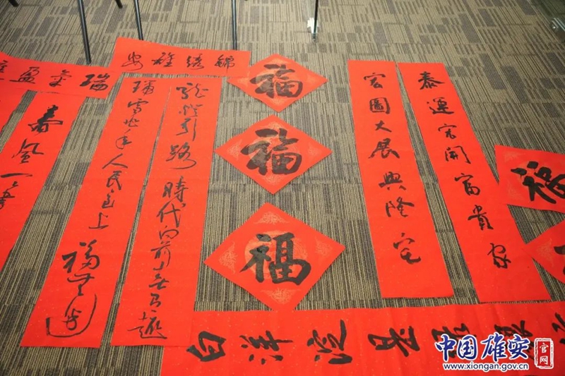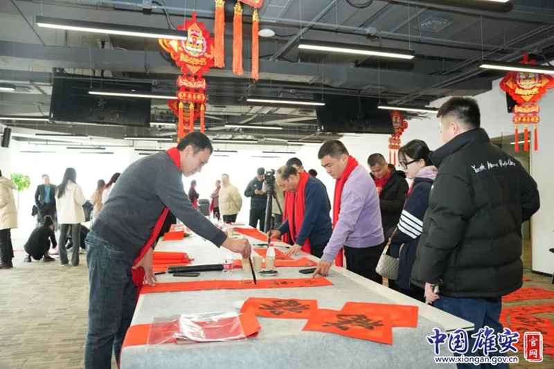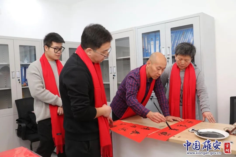 在雄安新区中关村科技园,优秀书法家组成文艺志愿者服务小分队,在台案上挥毫泼墨书写春联和“福”字,红底黑字的春联、福字一会儿便将活动室铺满,向企业家送上龙年新春的美好祝福。