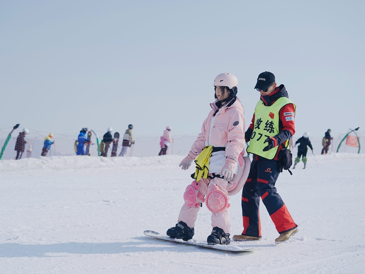 教学滑道上,初学者在滑雪教练的指导下,小心翼翼地练习着基本动作。