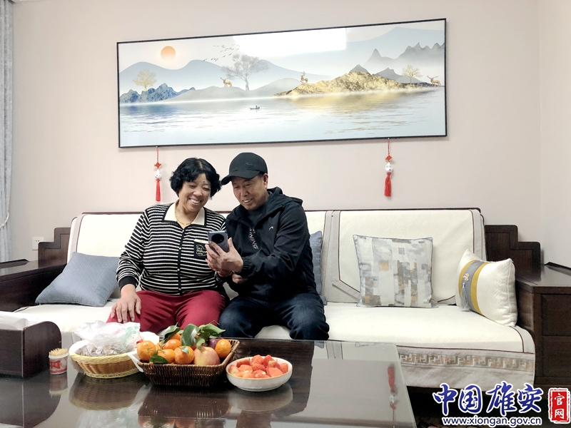 2月8日,李玉楼(左)和老伴儿正在通过视频电话和老邻居谈论入住新房后的感受。(徐华 摄)