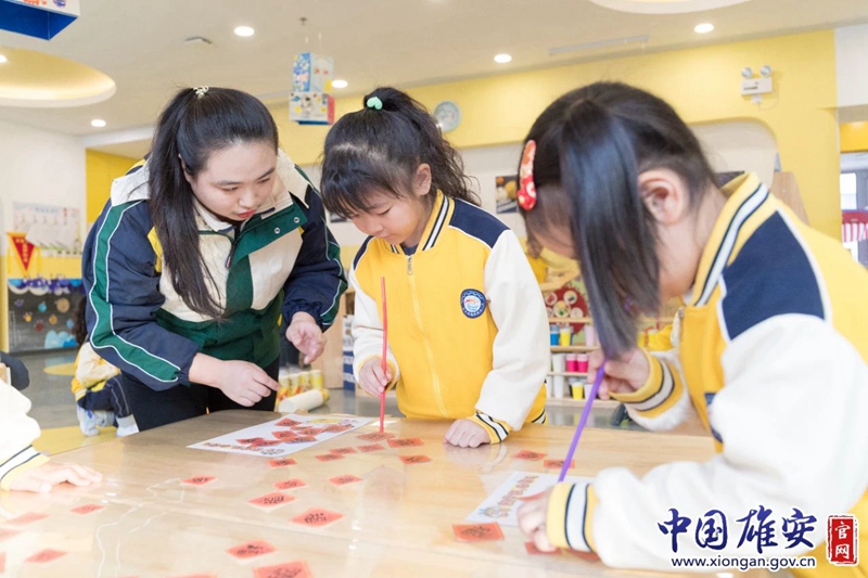 雄安容和朝晖幼儿园开园首日,小朋友在老师的陪伴下做“吸福”游戏。中国雄安官网李鑫 摄