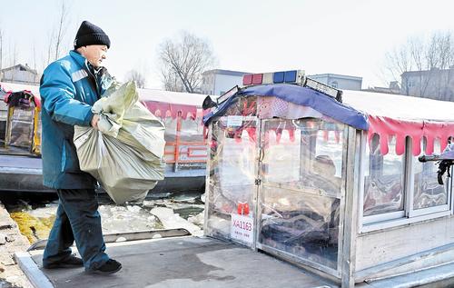 1月25日,杨小合将邮件包裹送到淀边码头“班船”上,让邮件随着“顺风船”送往淀中村。 河北日报记者刘光昱 摄