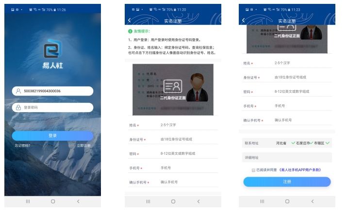 第二步:首次使用需要点击登录页面右下角“立即注册”,依次输入:姓名、身份证号、密码、手机号(两遍),并勾选《易人社手机APP用户条款》完成用户注册(已注册人员跳过第二步)。