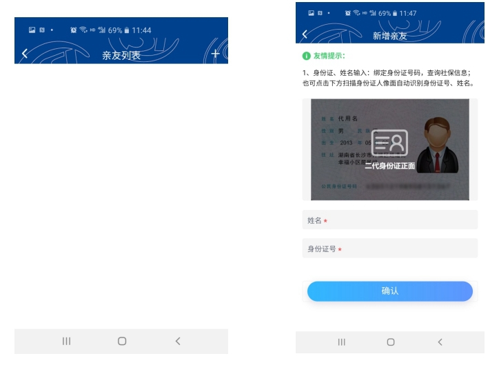 点击养老待遇资格认证下方的“帮亲友认证”进入亲友列表。点击右上角的“+”可新增亲友,可手动输入姓名、身份证号,也可扫描身份证自动录入,点击确认,即可新增亲友。