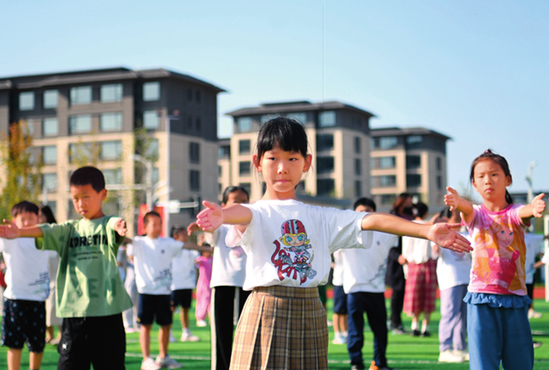 雄安史家胡同小学学生在操场上做体操(2023年9月13日摄)朱旭东摄/本刊