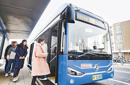 3月4日,在雄安新区310路公交站点,乘客有秩序地上车。河北日报记者刘光昱 摄