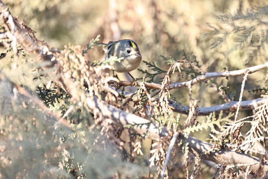 戴菊,国家“三有”保护动物,隶属雀形目戴菊科。戴菊头顶中央具柠檬黄色或橙黄色羽冠,两侧有明显的黑色侧冠纹,眼周灰白色。腰和尾上覆羽黄绿色,两翅和尾黑褐色。性格活泼,敏捷好动,白天几乎不停地活动,在树枝间来回跳动或短距离飞行。通常独栖于针叶林的林冠下层。