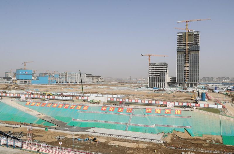 3月2日拍摄的雄安城际站及国贸中心项目建设现场。(单宇琦 摄)