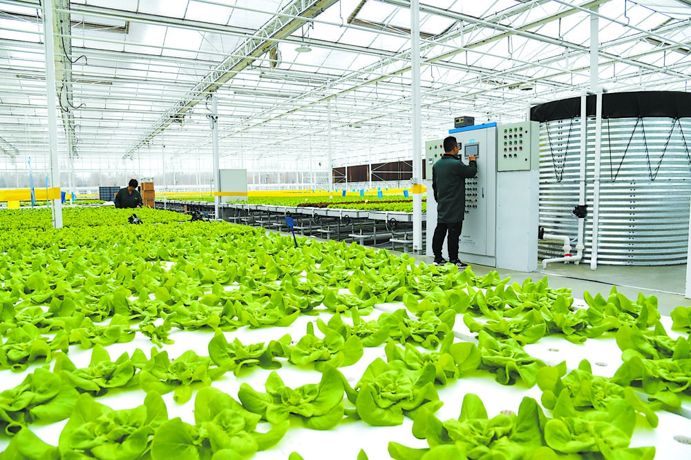 3月24日,在位于石家庄市鹿泉区的新兴际华(河北)农艺生态有限公司智能玻璃温室,工作人员正在对水培蔬菜进行管理。该智慧农业设施采用先进的中央环控系统,实现了对温室内温、光、水、气、肥等要素的全智能化控制调节,为乡村振兴注入了新活力。张震 摄