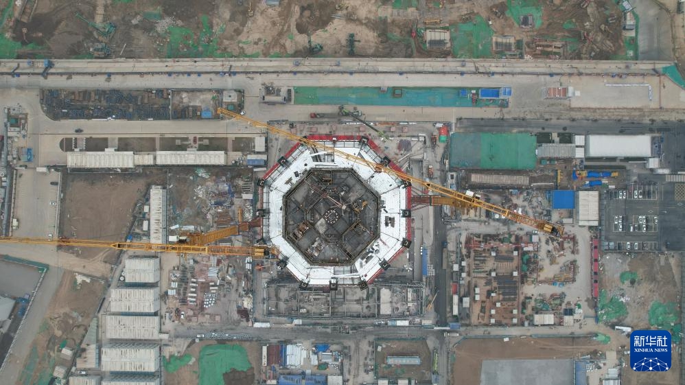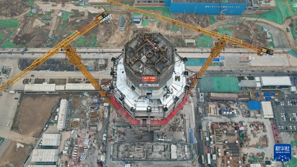 3月27日拍摄的中国中化大厦建设现场(无人机照片)。