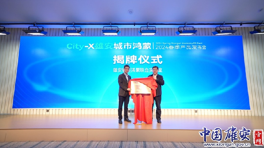雄安国创中心科技有限公司董事长房保国、河北雄安城市鸿蒙科技有限公司总经理王海生共同为雄安城市鸿蒙创新实验室揭牌。杨程 摄
