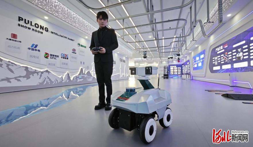 近日,雄安新区科创中心中试基地内,北京普龙科技有限公司销售部总经理童浩轩演示操作智能巡检机器人。河北日报记者曹铮 摄