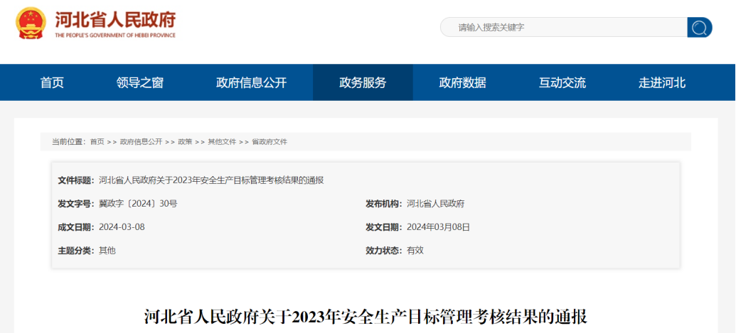 日前,河北省人民政府发布关于2023年安全生产目标管理考核结果的通报,详情如下。