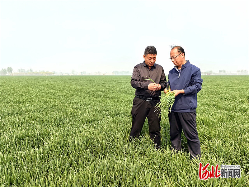 4月8日,望都县农业农村局农业技术推广研究员王建威(右)和种粮大户正在查看小麦苗情。河北日报记者郝东伟 摄