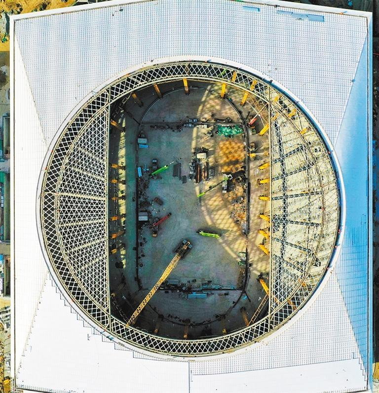 眼前直径近百米的基坑内,共计56根钢结构柱高高竖起,两台塔吊矗立,“金芦苇”造型的建筑初露真容。