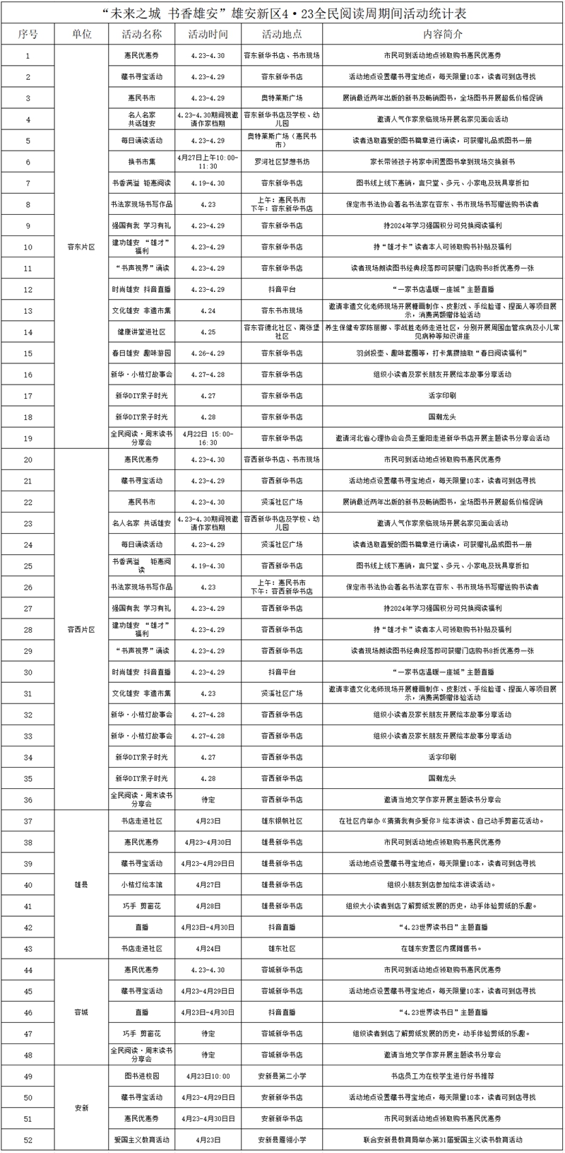 据悉,全民阅读周期间,容东片区、容西片区及三县将开展“藏书寻宝”“强国有我 学习有礼”“新华·小桔灯故事会”“书声视界诵读”等20余项趣味性强、参与度高的线下互动活动,为新区广大读者献上书香盛宴。