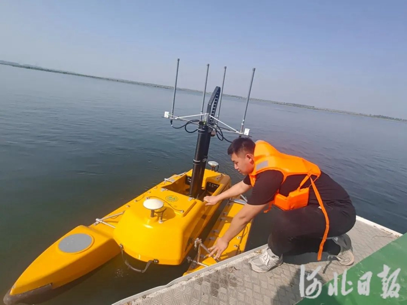 “白洋淀淀泊星罗棋布,沟壕纵横交错,许多狭窄的河道处,大型船只无法通行,有了无人船就能轻松应对。这艘船底部有一个声呐检测仪,可通过声呐测扫发现偷排污水的暗管。”张冬生站在“雄安1号”监测船的甲板上,用遥控器控制无人船的行驶方向。这艘全自动多功能无人船可实现12项指标的监测,包括pH值、溶解氧、氨氮、总磷等,水质监测的结果数值可以实时上传到监控指挥中心。