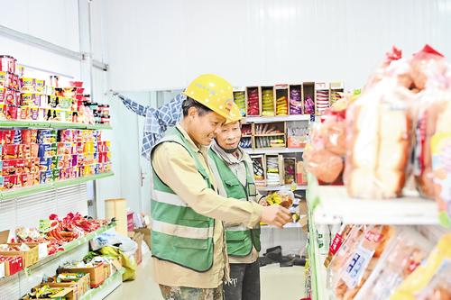 4月30日,中铁十七局雄忻高铁雄安地下段1标段项目产业工人社区内,普工岗工人杜海平(右)下班后跟工友来到工友超市选购商品。河北日报记者曹铮 摄