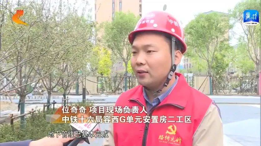 中铁十六局容西G单元安置房二工区项目现场负责人 位奇奇:地下管线已基本完成,小区绿化已经完成90%以上。下一步,我们将开展健步跑道、健身器材的安装与铺设。