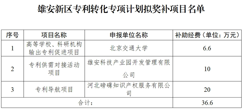 根据《雄安新区专利转化专项计划资金管理办法(试行)》(雄安执法发46号)、《雄安新区专利转化专项计划实施项目申报指南》等文件的有关要求,雄安新区专利转化专项计划第三轮申报项目已完成专家评审等程序。现将上述项目名称、单位等向社会公示,若无异议后进行奖补;如有异议,请在公示之日起5个工作日(5月8日至5月13日)内提出书面意见,并注明真实姓名、工作单位和联系电话,否则不予受理。