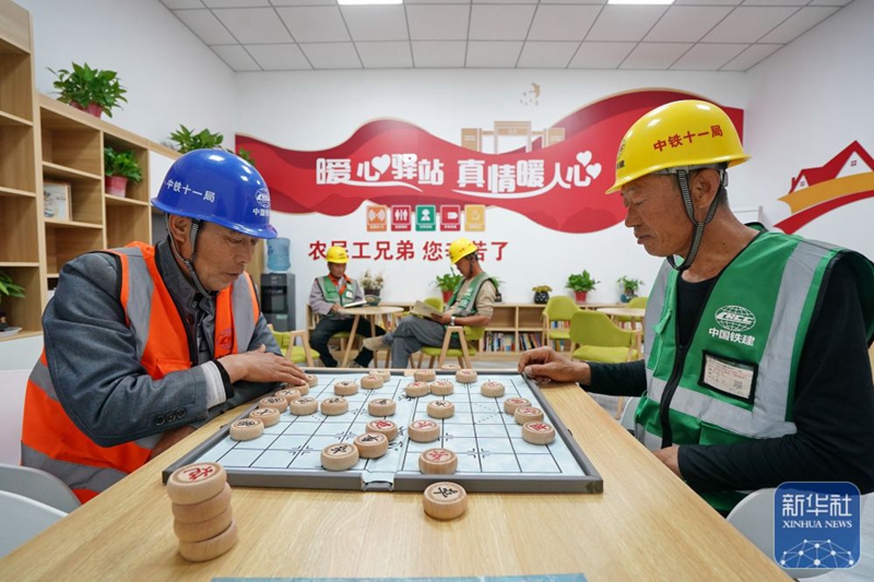 5月9日,中铁十一局建设者在雄安新区大河片区一处暖心驿站内下象棋。新华社记者牟宇 摄