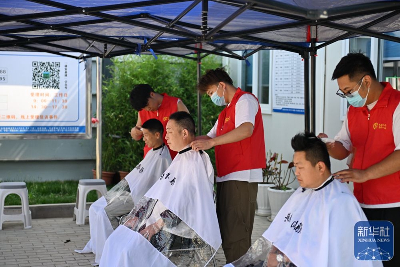 5月9日,在雄安新区启动区,中铁一局启动区EA4项目暖心驿站的志愿者在为建筑工人义务理发。新华社记者牟宇 摄