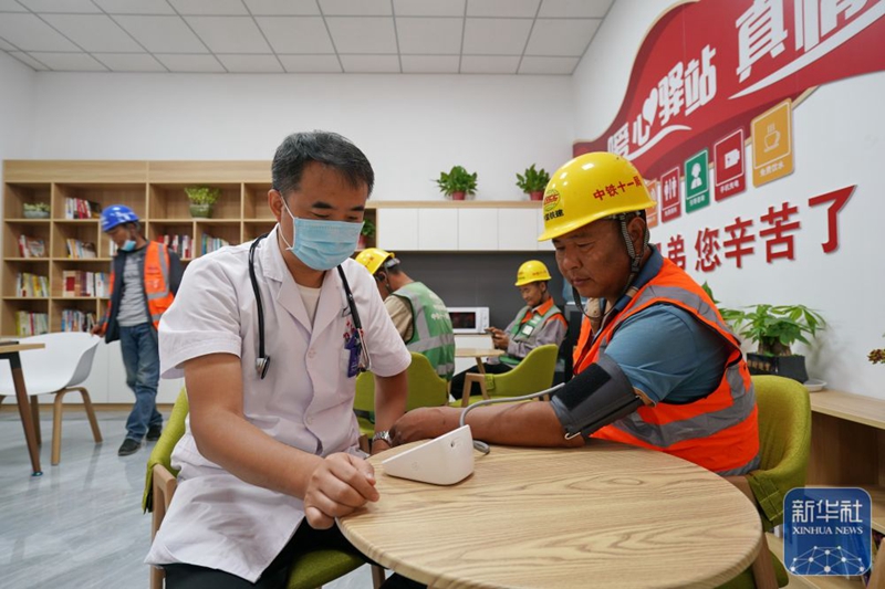 5月9日,医务人员在雄安新区大河片区一处暖心驿站内为中铁十一局建设者测量血压。新华社记者牟宇 摄