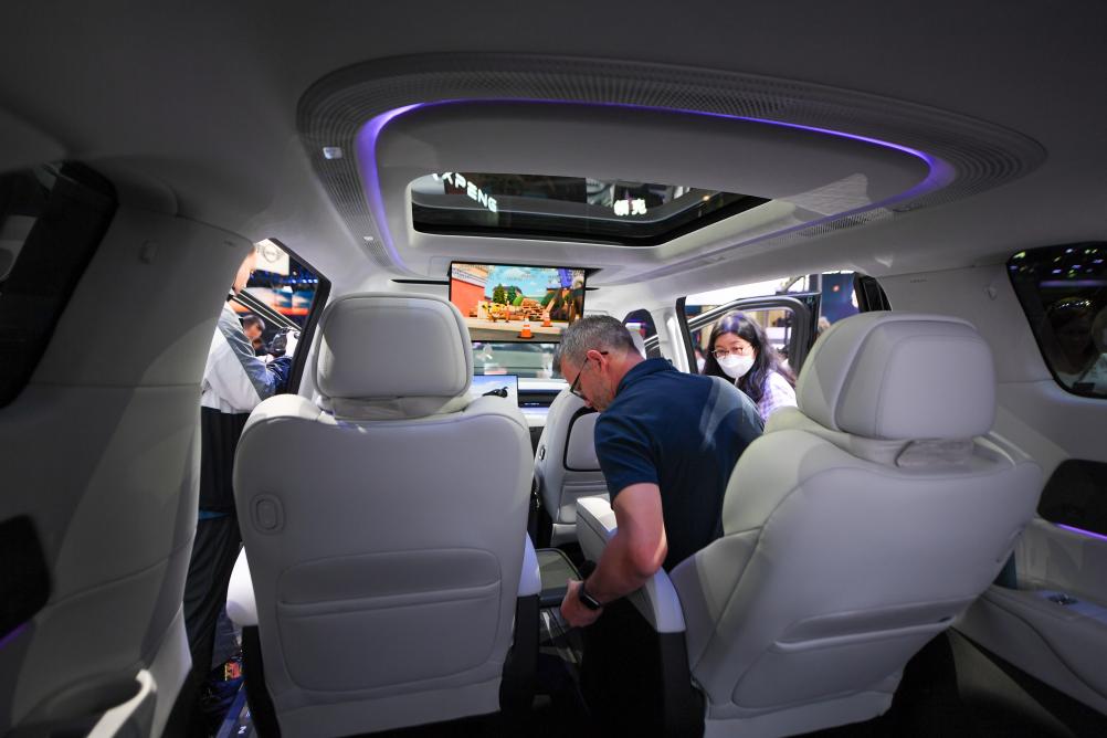 在北京中国国际展览中心顺义馆举行的2024北京车展上,参观者在小鹏汽车展区体验小鹏X9新能源汽车(2024年4月25日摄)。新华社记者鞠焕宗 摄