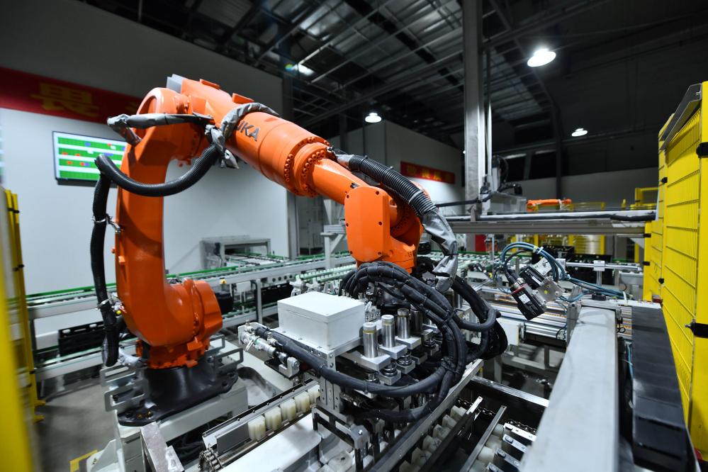 在广西柳州市一家新能源汽车电池生产企业,机器人在生产线上作业(2023年5月10日摄)。新华社记者黄孝邦 摄