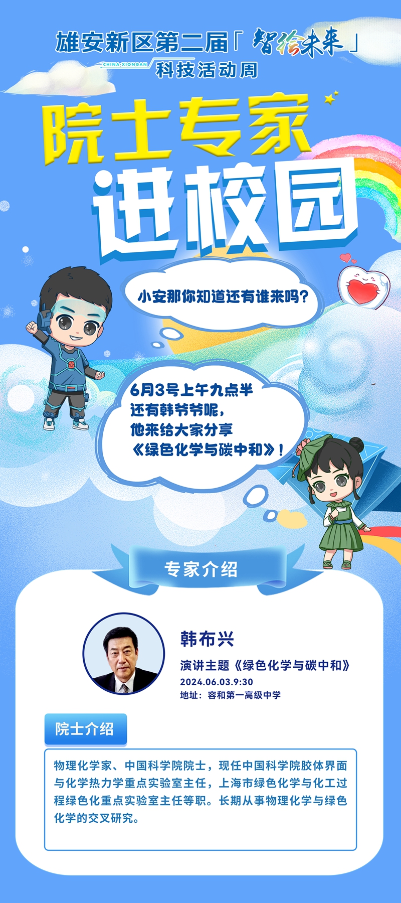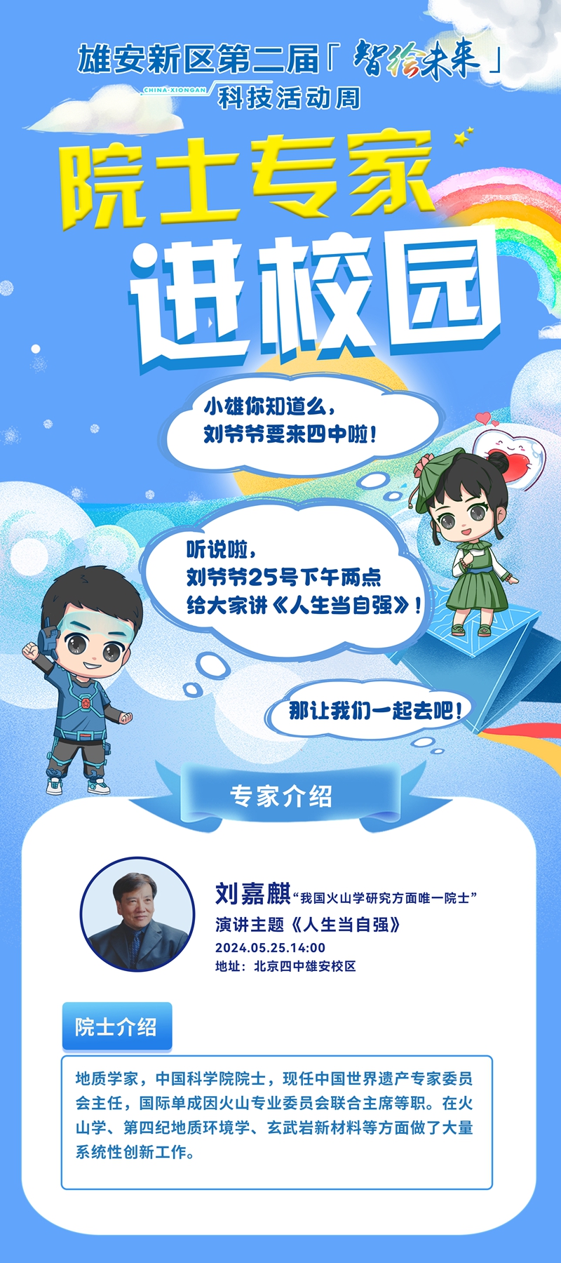 本次科技活动周以“向新·启迪,弘扬科学家精神,激发全社会创新活力”为主题,将集中组织“1+11”主体活动,即举办1场启动活动、11场专题活动,首场专题活动——院士专家进校园活动将分别于5月25日和6月3日开展。届时,刘嘉麒院士、韩布兴院士将分别走进北京四中雄安校区、容和第一高级中学,面向学校青少年传播科学知识,激发青少年崇尚科学、探索未知的兴趣。